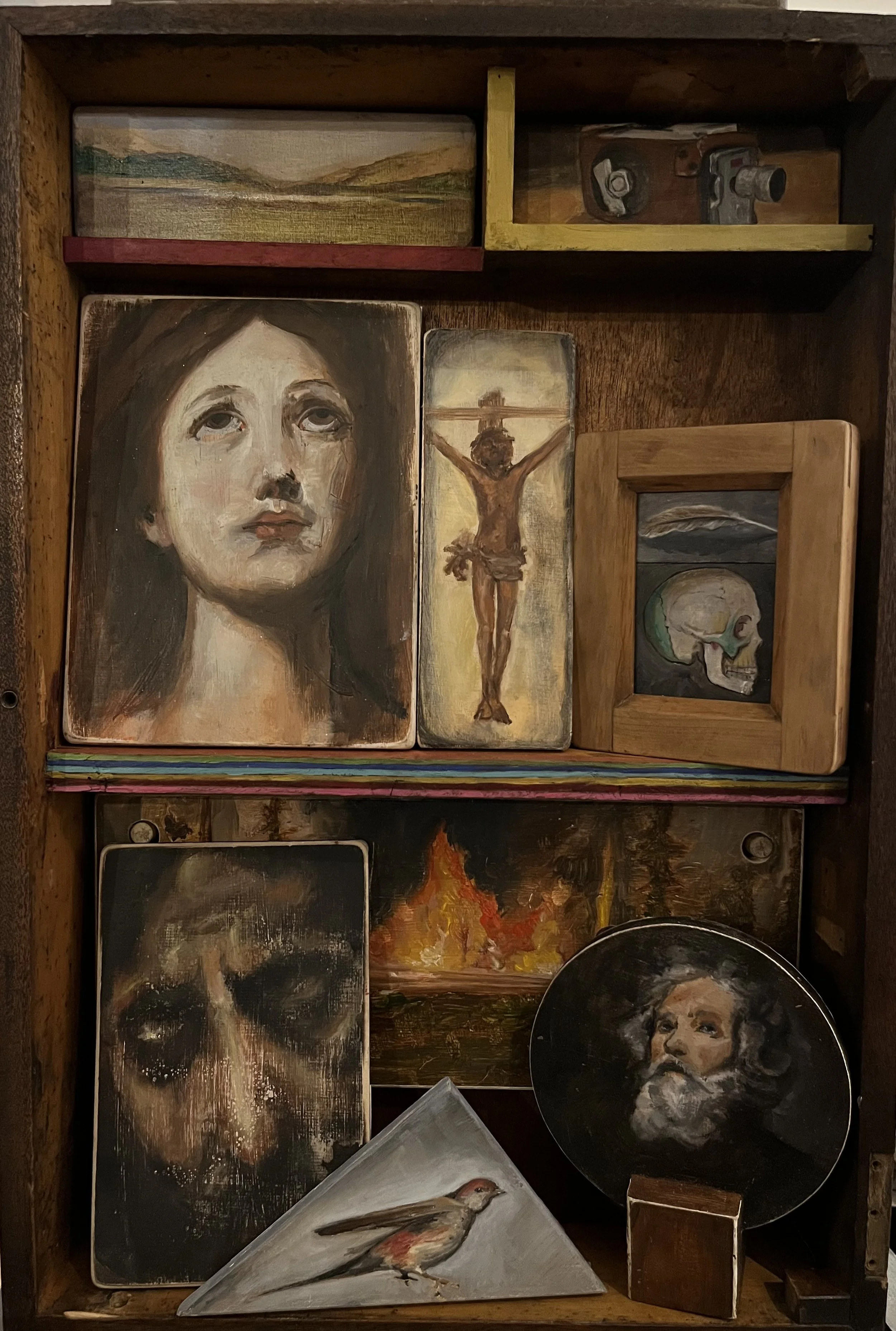 Oil on Slate & Wood with Collage and Artist made Hand-Painted Frame. Outer Section: Oil paint on slate on Duplicator Printing box exterior. Inner Section: Oil on slate of Thomas Reid on door with interior collage and three painted removable wooden blocks